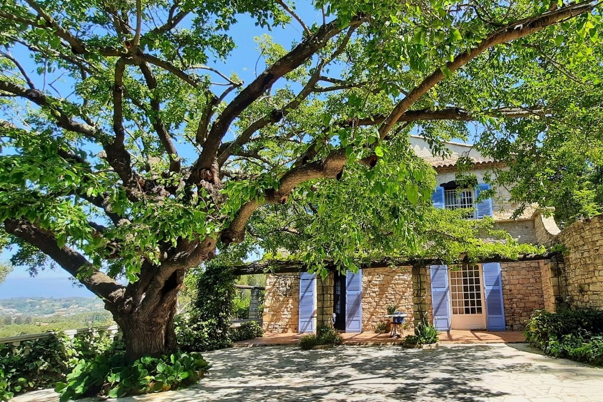 C’est une somptueuse bastide nichée au cœur d’un parc enchanteur de 5 hectares, avec une vue imprenable sur le village de Mougins. Une ancienne bergerie aux volets bleu lavande ornée d’un impressionnant mûrier blanc qui déploie ses branches au-dessus de la terrasse. C’est cet arbre, typique de son pays d’origine, l’Iran, qui a séduit la maman des actuelles propriétaires Shiva et Eliza, lorsqu’elle a  acquis la propriété en 1978.