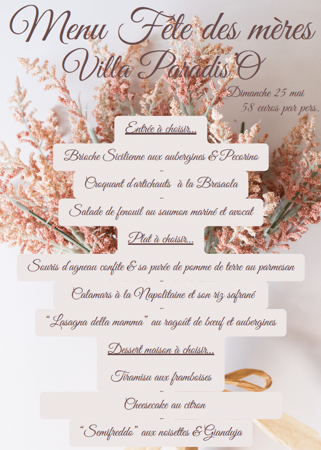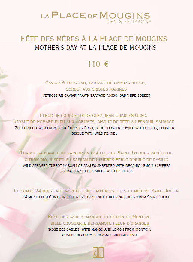 Rendez-vous ce dimanche 25 mai pour cĂ©lĂ©brer la FĂȘte des mĂšres. Pour l’occasion, rĂ©unissez-vous en famille autour d’une des tables mouginoises, oĂč de nombreux restaurateurs ont prĂ©parĂ© des menus spĂ©ciaux pleins de saveurs et d’amour !